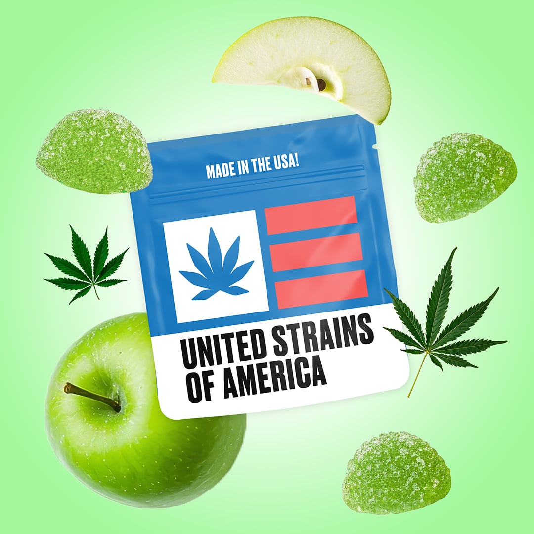 Presented by United Strains of America, the 15mg Sour Apple Gummies offer a perfectly balanced, invigorating experience. Each vegan gummy delivers a consistent 15mg of hemp-derived Delta-9 THC wrapped in the sharp, tantalizing zest of green apple for a burst of clean energy and mood-elevating effects.