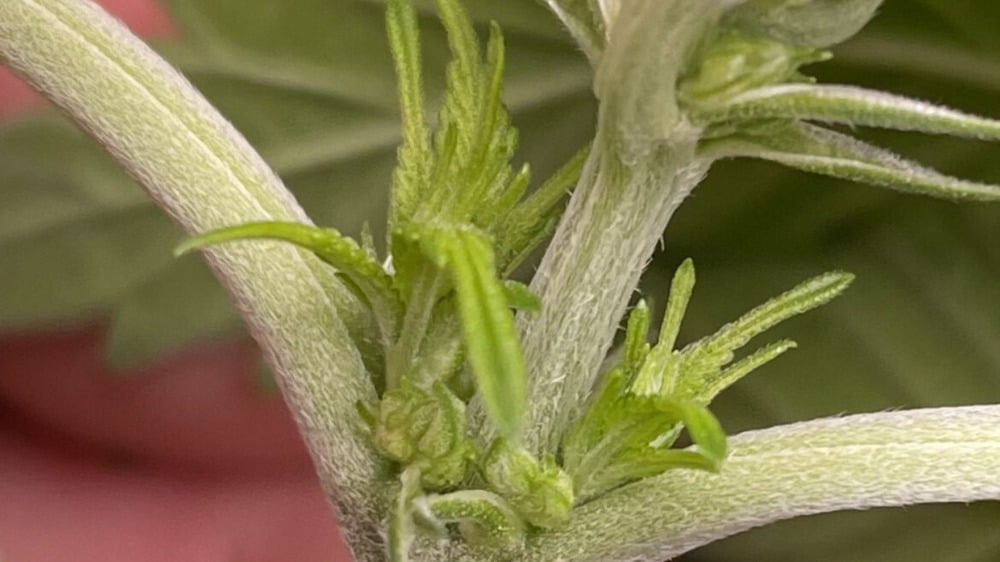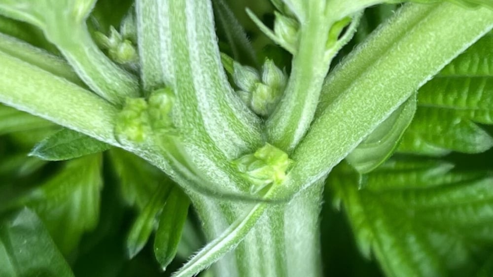 This shift causes hormonal changes that lead to the formation of pre-flowers at the nodes, where branches meet the main stem. These pre-flowers are the first reliable visual clues of cannabis plant sex.