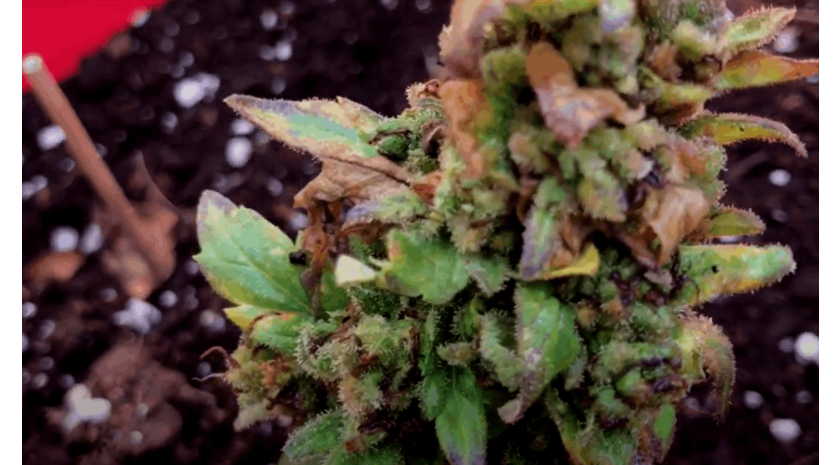 - Stem discoloration: Red or purple stems by themselves aren’t anything to worry about and naturally occur in many strains. However, when this happens alongside other symptoms, it’s a potential indicator of a cannabis phosphorus deficiency.